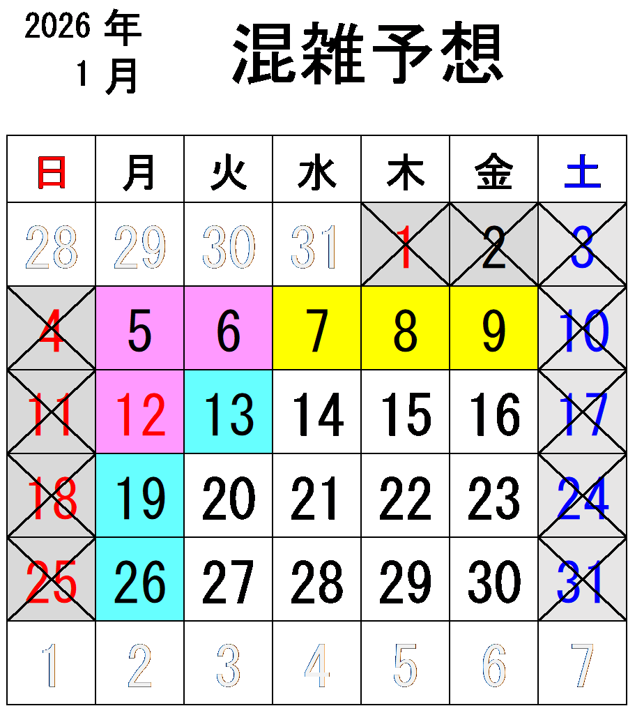 年末年始や大型連休の前後は混雑することが予想されます。長時間お待ちいただく場合もありますので、時間に余裕を持ってご来場ください。